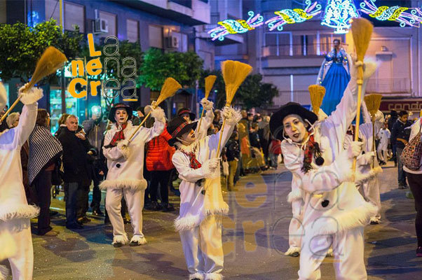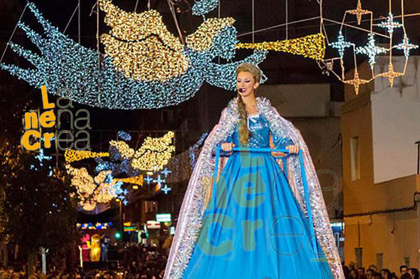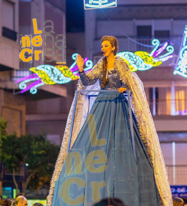 En el centro del pasacalles, aparece sobre una plataforma de 3 metros la deslumbrante Princesa de Hielo, con su vestido brillante flotando al compás del viento. Su presencia mágica y elegante hechiza a grandes y pequeños, creando un momento visual inolvidable.